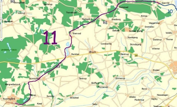 Klokken er over et, før jeg er parat til at påbegynde dagens vandring. Det er søndag, og der er kun få busser tilgængelige til dette hjørne af Djursland. Min rute går ind i landet, ad banestien til Ryomgård, det bliver en vandretur uden udsigt til havet.