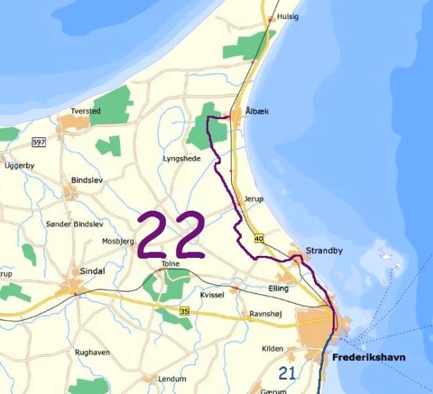 Hvor plantagevejen møder asfalt drejer jeg væk fra ruten. Der er et par kilometer til Ålbæk, hvor jeg tager et af Skagenbanens blå toge til Frederikshavn, og derfra en blå x-bus til Ålborg.