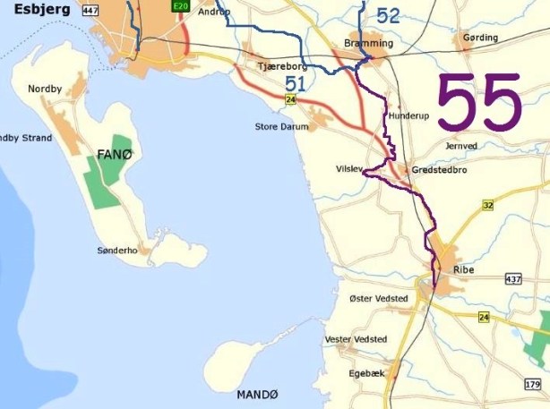 Jeg når landevejen til Ribe og gør et forsøg på at krydse ad grusveje over til den markerede rute, der går parallelt en lille kilometer længere inde i landet. Desværre stemmer kort og virkelighed ikke overens, og jeg må gå tilbage og videre ad landevejen. Min indsats er dog ikke helt spildt: et mindre kobbel store gårdhunde benytter min tilsynekomst til et heroisk raserianfald. Til og med har de en dejlig stor indhegnet have til rådighed, så de kan følge mig et pænt langt stykke på vej. I byen går hunde forbi folk uden at værdige dem et blik, på landet er der mindre trafik og mere plads til territoriebevidsthed og selvfølelse hos en hund. For ikke at tale om en hundeflok.