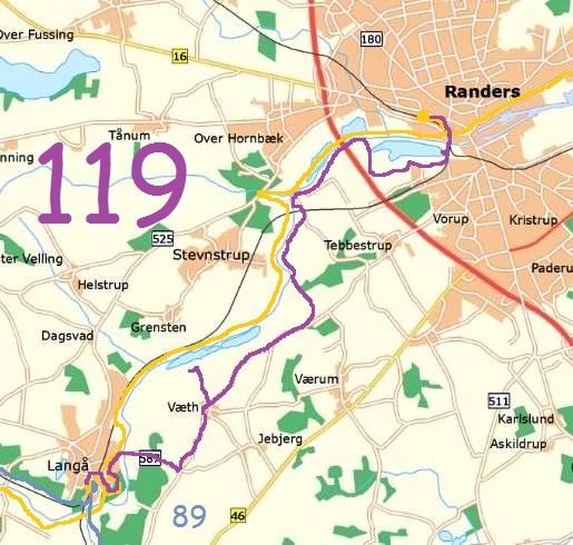Randers-Langå (syd for Gudenåen), 24 km (119).