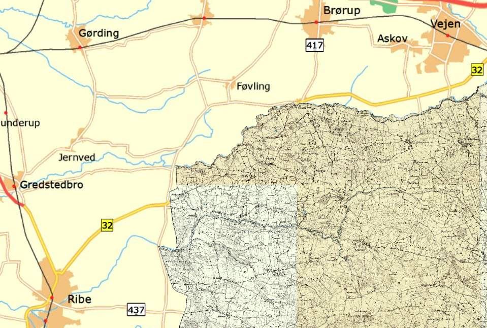 Grænsen 1864-1920: Historiske generalstabskort fra Prøjsen, overlejret Geodatastyrelsens moderne landkort.