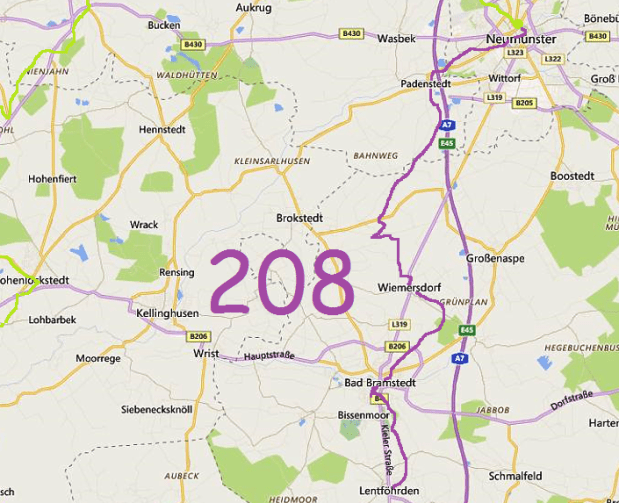 Jeg begynder dagen med at genfinde Oksevejen det sted, jeg forlod den dagen før (vandredag 207), hvor den parklignende skov vest for Neumünster støder op til et ældre villakvarter. Herfra går vejen ned ad en lang bakke mod centrum af byen. Selv ved otte-tiden om morgenen er det allerede varmt i solskinnet, og med de høje gamle træer i villahaverne og de mange blomstrende rododendronbuske i forskellige farver er det en ganske idyllisk scene.