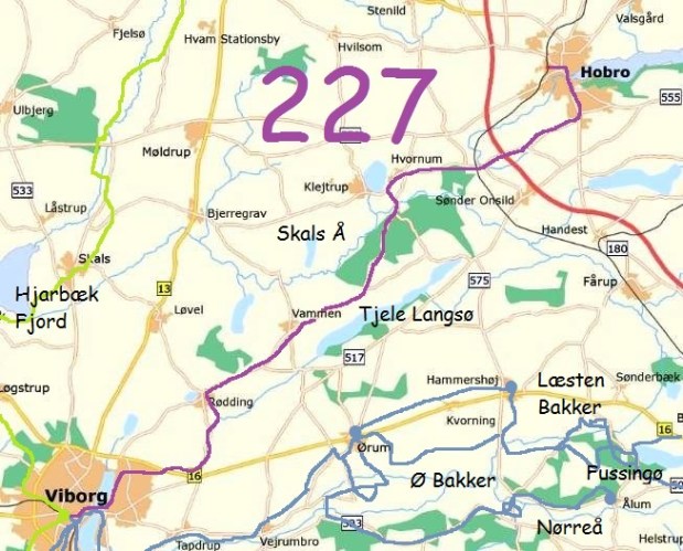 En stor å slanger sig igennem engene. Det er Skals Å, på vej fra Fussingø, som jeg besøgte på min forrige vandretur (226), til udløbet i Hjarbæk Fjord, kort efter den krydses af Hærvejens gren mod Løgstør og Hirtshals. (vandredag 200).