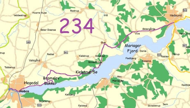 Jeg går ad landevejen et par kilometer mod øst. Fjorden er nær ved, men kun synlig hvor tværgående kløfter fører ud til vandet. Kort efter er jeg tilbage på grusvej, den cykelrute jeg nu følger søger over bakkerne tilbage til fjorden, som den når ved Kielstrup Sø, blot adskilt med få meter fra en lille bugt umiddelbart over for Mariager, på sydsiden af fjorden.