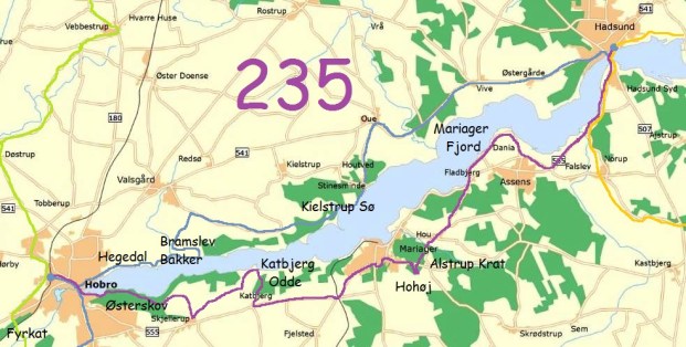 Det er vel ikke overraskende, men terrænet er næsten en eksakt kopi af sidste uges oplevelse. Mariager Fjord er grundlæggende en dyb slugt skåret ned i et fladere plateau. I løbet af et par hundrede meter i luftlinje fra strandbredden og ind i landet stiger man halvtreds højdemetre eller mere. Jeg følger grusveje og småveje mod sydøst til landsbyen Skjellerup og derefter ud mod kysten igen. I dag følger jeg cykelruten rundt om Mariager Fjord.
