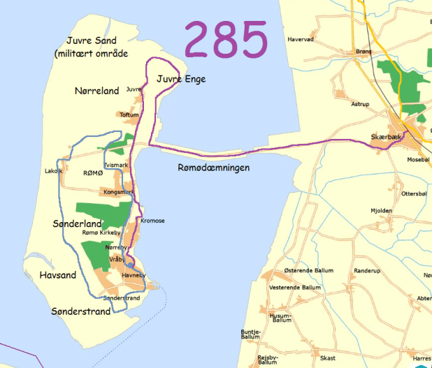 Kort efter når jeg frem til Rømøs største vejkryds: landevejen nord-syd krydses af vejen øst-vest fra Rømødæmningen til badestedet og feriecentret Lakolk på øens vestkyst. Senere på dagen skal jeg gå ad dæmningen til fastlandet. Først skal jeg dog på en rundtur i den nordlige del af øen. Det er en tur på fladt, inddæmmet land med små landsbyer, ikke meget mere end klynger af gårde. I vest kan jeg se en lav række af indlandsklitter. Som jeg så i går begynder hederne og plantagerne der.