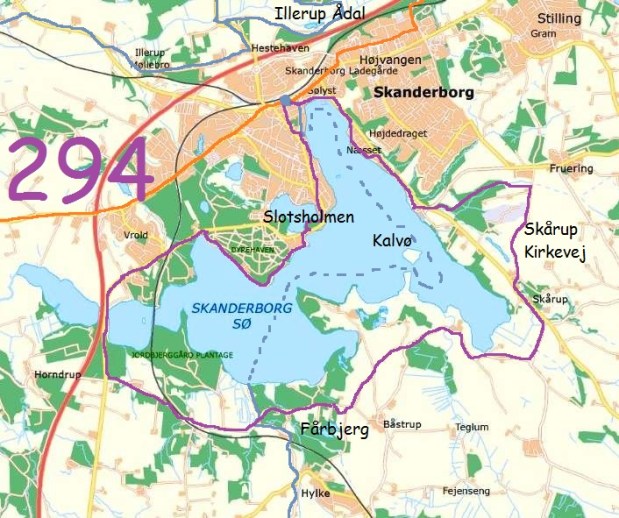 Umiddelbart syd for byen går jeg gennem bøgeskoven og når så frem til Slotsholmen. I sin tid lå Skanderborg Slot på den høje slotsbanke her. Slottet blev revet ned i syttenhundredtallet, men slotskapellet og et hjørnetårn blev bevaret og udgør stadigt Skanderborg Slotskirke. Oprindelig blev slottet opført efter reformation i femtenhundredtallet, under benyttelse af byggematerialer fra nedrivningen af Øm Kloster (vandredag 79).