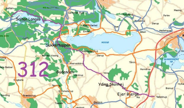 På trods af de vidstrakte skove – og deres betragtelige højde – var meget af dette land faktisk engang hede. På det næste stræk af min rute er sporene stadigt tydelige, der vokser masser af enebuske og lyng langs skovvejen, her og der er der små moser, tilgroede med birketræer, men stadigt lysåbne. Store partier af skovbunden er dækket af blåbærris. Bakkerne omkring Silkeborgsøerne deler samme historie, og ved de fredede hedebakker Sindbjerg og Stoubjerg (vandredag 112) kan man danne sig et indtryk af, hvordan store dele af denne egn engang har set ud. En hulvej har skåret sig en halv meter ned i terrænet og afslører, hvordan sandet begynder få centimeter under skovbunden.