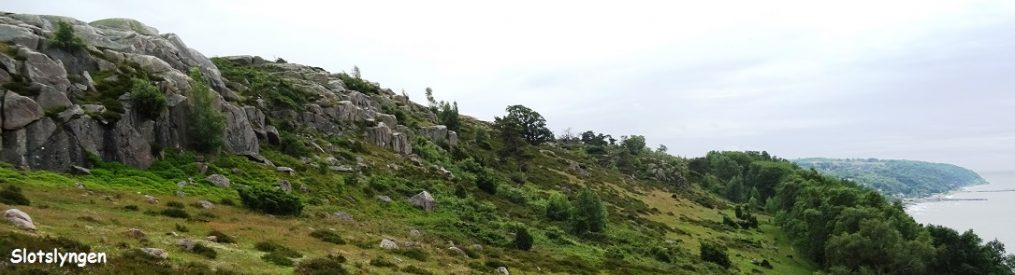 Alt ånder fred ved vigen. Måger og en enkelt skarv hviler på de store sten i vandkanten. Et smal hvidt bånd af sandstrand tegner kysten op. Jeg følger en jordsti gennem skoven oven for skrænten. Fjorden er få meter borte, men kun synligt gennem tæt grenværk. Inde i skoven er stien truet af jordskred. Et kort stræk kommer jeg til at gå i kanten af golfbanen.