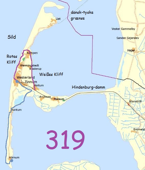 Jeg krydser klitheden og landevejen og når ud til øens østside umiddelbart nord for Kampen. Her er der eng og flad marsk med faskiner og slikgårde. I nord rejser en klint sig dog med hvide sandflader ud mod havet. Længere væk ses havnebyen List, hvorfra der er færge til Havneby på Rømø. Sild ender i en slags krabbeklo, kaldet Albuen, hvor et fyrtårn i rød-hvide bolsjefarver er synligt med det blotte øje fra sydspidsen af Rømø (vandredag 284).
