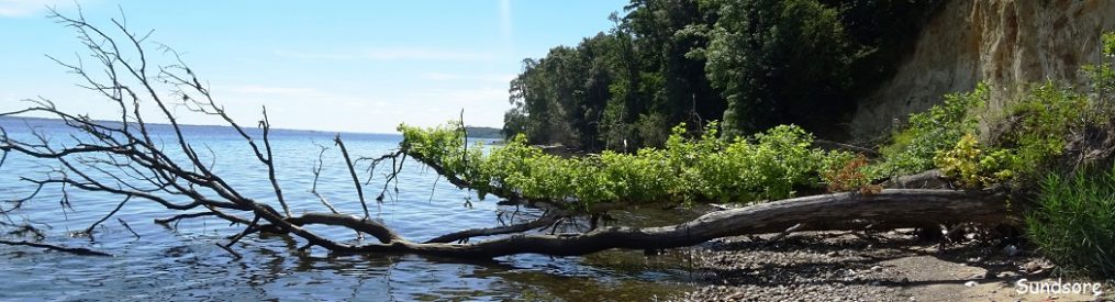 Jeg var her i området for fire år siden (vandredag 105). Den gang gik jeg langs stranden neden for den fyrre meter høje klint. I dag tager jeg stien oven for skrænterne. Her fører et fladt grønt plateau ud til den øvre skrænts flossede kant; klinten står på de stejleste steder med rå sandflader. Nedenfor er der en bred sandstrand, beskyttet med høfder, hvad der får kystlinjen til at fremstå som sammensat af små cirkelbuer; havet aflejrer sand på nordsiden af høfderne og æder det væk fra sydsiden. Den snørklede kystlinje er trukket skarpt op af havstokkens hvide skum.