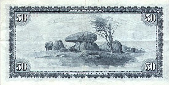 Den nuværende 50-krone-seddel har også et oldtidstema: Skarpsallingkarret. Ligesom stendyssen er den omkring 5000 år gammel. Originalen opbevares på Nationalmuseet, der er en kopi i Vesthimmerlandsmuseum, og på fundstedet, en plantage nær de Himmerlandske Heder er der opstillet en mindesten (vandredag 225).