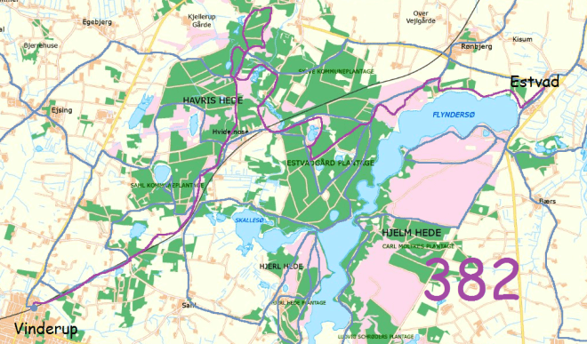 En smal vandresti følger jernbanen mod syd, vokser til hjulspor, og, som jeg nærmer mig huse, velholdt grusvej. Et stykke krydser jeg igen landevej, blot for at skifte til den lokale vandresti, der følger jernbanen hele vejen ind til Vinderup (vandredag 354). Plantagerne er afløst af uhøstede majsmarker og enge. Heste, kvæg og får græsser under solen. Lyngen er forsvundet, men store klynger af blomstrende gederams fastholder den lilla farve.