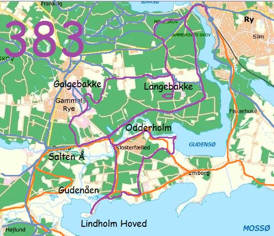 I første omgang går jeg mod syd, ud af byen, krydser Gudenåen ved den gamle mølle og ålekisten. En enkelt turbåd ligger til kajs. Hvor jeg går ind i skoven syd for søerne, er der sat vildthegn op og etableret en kvægrist. Meget af skovene her hører under skovgodset Rye Nørskov (vandredag 368), som hæger om hjorte og jagtindtægter og derfor sætter stadigt mere hegn op. Det kan skabe vanskeligheder for vandreren. I første omgang går jeg dog blot frisk til, ind i skoven og op ad en bakket skovvej.