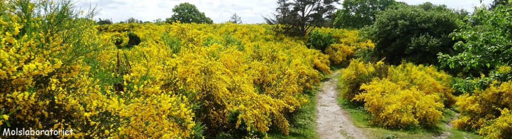 Det er Frøbjerg Bavnehøj, Fyns højeste punkt (131 m). Jeg følger den afmærkede sti, fra bakketop til bakketop. Der står flere mindesten her, blandt andet for stavnsbåndets ophævelse og Genforeningen. Nogle få gamle, tykke bøgestammer blander sig med slankere bøge. Stien går i en spiral mod toppen, med videre udsigt end på tvillingebakken i vest. Selv om det er de hvide blomster i skovbryn, krat og hegn, der dominerer landskabet, så er der også et stænk af gult: Vorterod på skovbund, påskeliljer undsluppet fra nærtliggende haver, nogle få mælkebøtter, endnu uden en eneste grå fnugkugle imellem, og, her på den sydvendte bakkeside, er der også en håndfuld lav gyvel, som er begyndt at blomstre.