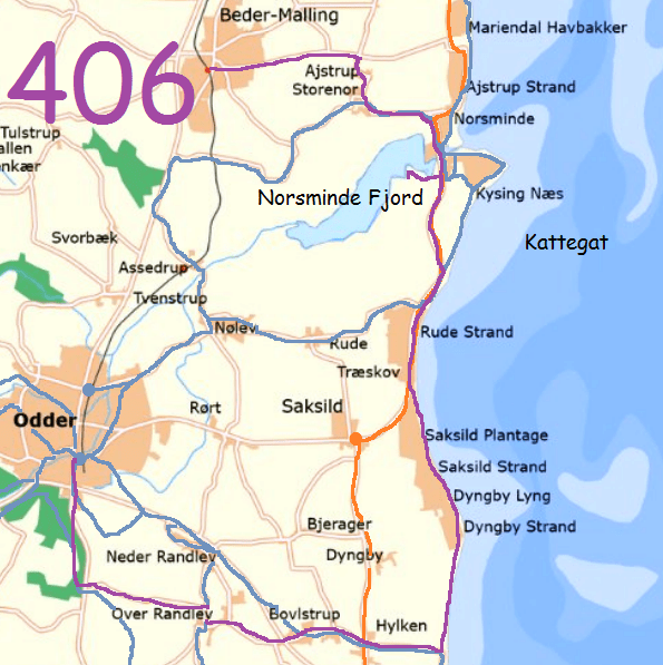 Et kort stykke vej på den anden side af Randlev når jeg frem til ådalen og skovene syd for Odder (vandredag 299). Ådalens bund er dækket af gammel mose og eng, mens den vestlige bakkeside er bevokset med høj gammel bøgeskov, godsskov. Bøgens lysegrønne løv rækker fra underskoven til de højeste trækroner. Der er stadig anemoner på skovbunden, men også fladstjerne og skovmærker står med små hvide blomsterkroner. Fra skovbrynet kan jeg træde direkte ind i Odders villakvarter, og snart efter er jeg fremme ved letbanestationen.