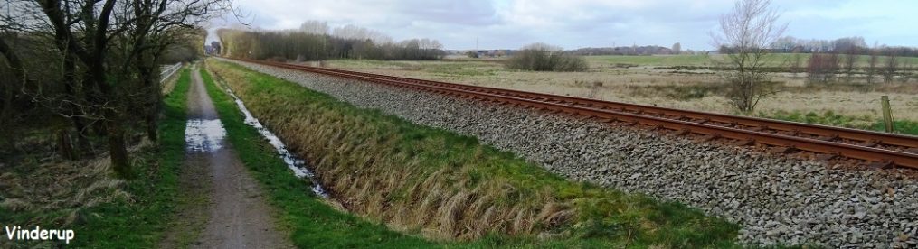 Til sidst når jeg dog frem til det punkt, hvor Trækstien møder den cykelsti, der løber langs jernbanen til Randers. Jeg er grundig træt af de mange kilometre i gummistøvler, så jeg skifter til vandrestøvler og beslutter mig for den mere pålidelige asfalt. På sydsiden af Gudenåen står store dele af engene under vand, de har endda fået hjælp til det, det er arealer ejet af Aage V. Jensens Fonde (vandredag 177). I dag er der stille, men på andre tidspunkter kan ænder og gæs høres på lang afstand. Nattens sne er næsten forsvundet fra landskabet, kun langs skyggede skovbryn ses hvide striber.