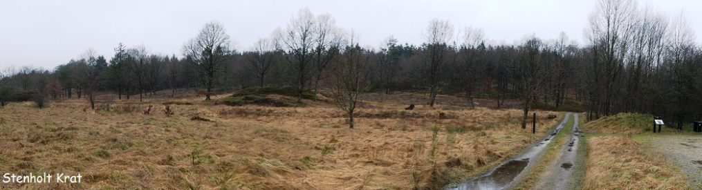 Tilbage på plateauet går min vandring ad små landeveje i en bue mod nordøst, gennem landsbyerne Stenild og Rørbæk, indtil jeg igen krydser motorvejen. Jeg ser fiskehejre et par gange ved små bække i kærene, der er musvågeskrig og en enkelt ravn i det åbne landskab, men ellers er det flokke af råger, der dominerer på markerne. De nysgerrige fugle betragter mig fra pæle og grene, men forsigtigheden vinder altid, og de går på vingerne, længe før jeg kommer nær. Sletter af uhøstet majs optager en stor del af det dyrkede land.