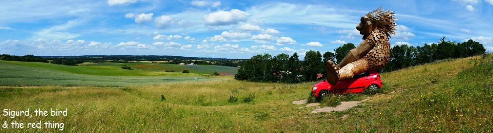 I udkanten af Skanderborg mødes jeg af en rundkørsel, der prydes af en træskulptur af Skanderborgfestivalens maskot. Derfra er der ikke langt til fortov og de sidste kilometer gennem forstaden Vrold, indtil jeg når stationen højt på bakkesiden.