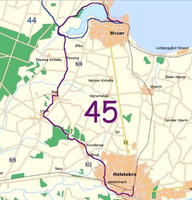 Endelig en dag hvor jeg kan gå fra togstation til togstation. Tilmed en tørvejrsdag. I Struer går jeg ad gågaden til dæmningen over Limfjorden. Jeg kommer til at gå på den inderste side, den forkerte side viser det sig, i kanten af en travl landevej. På den nordlige bred af Limfjorden er der en flot udsigt over Struer og til de to sider af Limfjorden. En smal jordsti udgår fra en parkeringsplads. Først går den gennem rørskov, så munder den ud i engbredden. Fiskehejrer jager på engen. Jeg betragter dem et kort øjeblik, før jeg kravler over et hegn, og de omsider får øje på mig og går på vingerne. Sortbrogede køer gumler uforstyrret videre. Længere fremme stiger flere hejrer til vejrs, tillige skarver. Jeg går i kanten af bakker og havskrænt. Efter et par kilometer står jeg i skov. Hvor afmærkningen af stien er tvetydig, kommer jeg ud i sumpet terræn, glider ved passage af en bæk i en grøft og indkasserer adskillige stik fra brændenælder. Til sidst må jeg stige op af en stejl skrænt, med store væltede stammer på tværs, for at genfinde en sti. Stien fører mig på rette vej, og jeg forlader skoven og følger grusvejen op til en landevejs asfalt. Der er store marker med korn her. Hvor en lysegrøn claas-mejetærsker er i gang med at høste de marker, der stod uhøstede hen i sidste uge, er jeg tilbage på Drivvejen. Jeg går en strækning af samme vej som sidst, stiger ned fra bakkerne og plateauet til Kilens vand. Undervejs gør jeg et kort afstikker op på et par hedebakker, hvor lyngen står i sart lilla, og jeg har en smuk udsigt hele vejen rundt, hedebakke med heste, grønne skrænter, Klosterhedens rand. I dalbunden drejer jeg stik syd, og dagens vandring ad ny drivvej begynder. Langsomt stiger jeg igen op af bakken, og herfra er der et langsomt, overordnet, fald i terrænet frem mod den flade hedeslette omkring Herning. Den slette, som begynder efter Engesvang, sådan som jeg ser det, når jeg sidder i toget fra Århus. Jeg kommer forbi et par små landsbyer, med små fine kirker, omgivet af stengærder, marker med græssende køer klods op ad dem. Derefter svinger ruten mod øst, tager retning mod Holstebro. Et langt stræk går jeg gennem en plantage, samme landevej som jeg har kørt ad mange gange, når jeg har taget rutebilen mellem Lemvig og Holstebro. Plantagen rummer stadig betydelige hedestræk, enkelte steder med gravhøje og naturlige bakker, dækket af lilla lyng. Efter plantagen bliver jeg ledt ind gennem stier i et parcelkvarter i en landsby og ind på en cykelrute til Holstebro. Som jeg nærmer mig byen, kommer jeg forbi det sted, hvor der et par uger før har været en stor international spejderlejr, stålskeletter til store fællestelte og raftedynger står tilbage. Længe fremme kommer jeg ind på et sumpet, udyrket terræn, der viser sig at udgøre en slags bypark i Holstebro. Jeg krydser jernbanen og indfaldsvejen fra Lemvig, fortsætter ad den snoede længde udyrket land og kommer til sidst ud til Storåen. Stien langs den fører mig helt ind til centrum af Holstebro, under jernbanen og hovedvejen sydpå, indtil jeg forlader den, og går et kort stræk, fuld af kunst, ad Holstebros gågade til stationen. Denne gang er jeg kommet ti minutter for sent til et tog. Og jeg slapper af med min bog og kold drikkelse ind til det næste tog ruller ind.