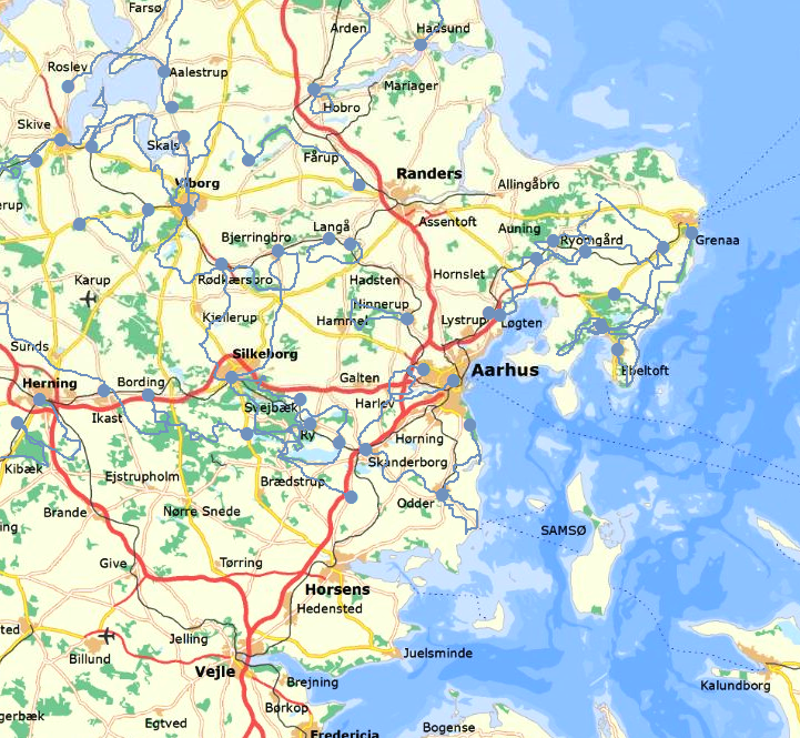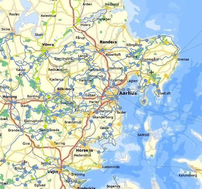 Den orange linje viser min tur Jylland Rundt på 80 Dage. Den blå linje viser senere vandredage. Den grønne linje viser vandring ad Hærvejen. Placer musemarkøren på linjen for at få information om de markerede strækninger, klik for at gå direkte til beskrivelsen af vandredagen. Brug menubjælken og rullemenuen for at se oversigtskortene specielt for Jylland Rundt. (Dette interaktive kort virker dårligt på mindre skærme. Alternativt kan punktet kronologi i menubjælken benyttes til at udvælge tidligere vandreture). Man kan også benytte søgeboksen, som er tilgængelig på forsiden (længst mod højre) og ved alle andre vandretursbeskrivelser (men ikke på oversigtssiderne).