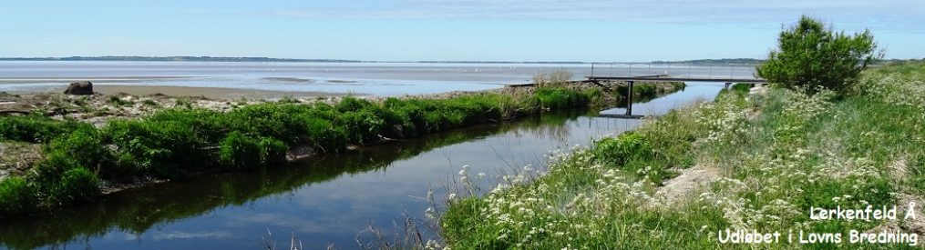 Det er vindstille, vandoverfladen har kun den fineste antydning af bølger. Nærmest stranden er den gennemsigtigt, så jeg kan se havbunden, længere ude er det blankt med flotte refleksioner. I syd kan jeg se Ulbjerg Klints høje skrænter, de næsten lodrette sider af råt sand tydelige mod de grønne skråninger der indrammer klinten. Forude snævres bredningen ind til en port mellem Lovnshalvøen i nord og, fra syd, Lundø (vandredag 355). Længst i vest ses landet på den fjerne side af Skive Fjord.
