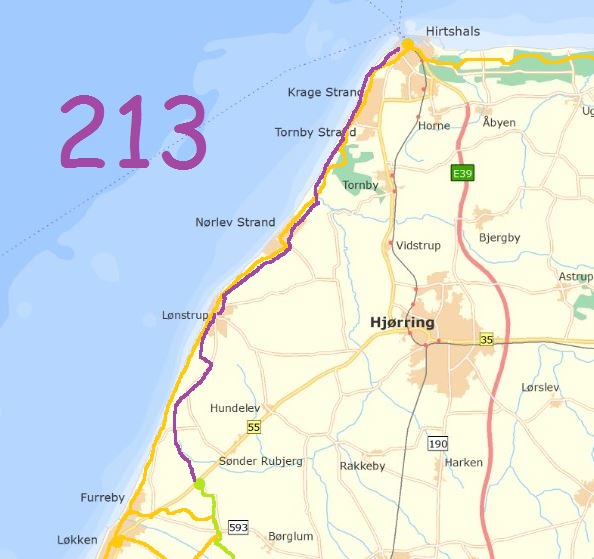 Den orange linje viser min tur Jylland Rundt på 80 Dage. Den grønne linje viser vandring ad Hærvejen. Placer musemarkøren på linjen for at få information om de markerede strækninger, klik for at gå direkte til beskrivelsen af vandredagen. Brug menubjælken og rullemenuen for at se oversigtskortene specielt for Jylland Rundt. Den lilla linje viser dagens vandrerute.