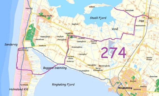 Efter at have fyldt mine vandflasker ved kirken går jeg ad landsbyens lange hovedgade mod syd, indtil jeg når landevejen mellem Ringkøbing og Søndervig. Bilerne kører tæt i begge retninger. Heldigvis skal jeg blot krydse den for at vandre videre ad en grusvej ud mod Ringkøbing Fjord.