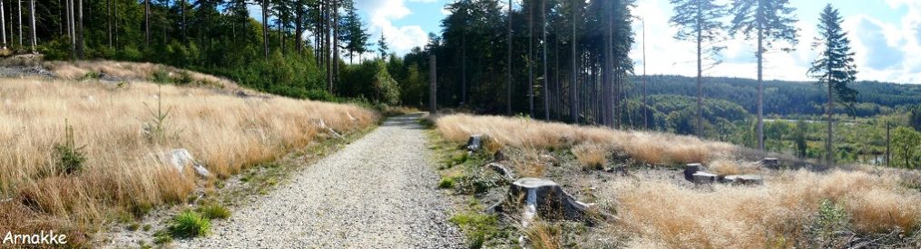 Et tilgroet hjulspor, på kanten til at forsvinde, løber hvor et nåleskovs- og et løvskovsparti mødes og fører ud til en central grusvej i nord-syd-retning. Jeg går mod syd, først forbi en gammel skovridergård, dernæst forbi en af Naturstyrelsens primitive overnatningspladser. Her er der en vandhane med koldt drikkevand, som jeg taknemmeligt benytter til at fylde mine vandflasker, hvis indhold jeg har gjort stort indhug på.