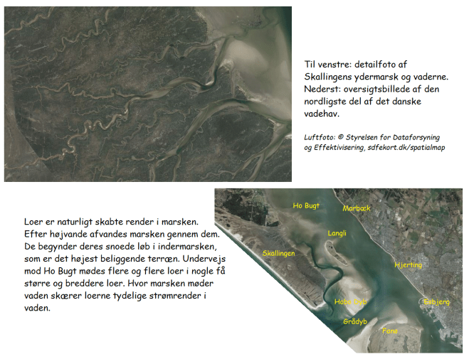 På grønsværen ligger de store algemåtter skyllet op og efterladt af tidevand, nu er de blegnet til hvidt. Jeg prikker til dem med vandrestokken, de har en sprukken papiragtig kvalitet som pappet i æggebakker. Loerne afvander ikke bare marsken, de fører naturligvis også højvandet ind i marsken. Især i vinterhalvåret kan den rigtige kombination af højvande og storm, med resulterende vandstuvning i Ho Bugt, føre til at vandet ikke blot fylder loerne, men også stiger op i marsken og blokerer vejen ud på Skallingen – på trods af at den næsten ligger helt ovre ved klitterne.