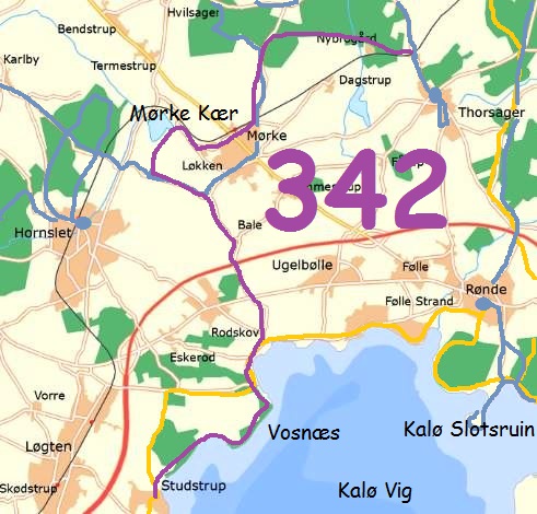 Strandvejen fører forbi en statelig gul bygning, den gamle færgekro. En bred stribe strandeng åbner sig ud mod en ganske smal strand, mens bittesmå sommerhuse ligger længere inde. På den anden side af bugten ses Kalø Slotsruin foran Mols Bjerge (vandredag 131). Som jeg følger stranden mod syd. frem mod Vosnæs, svinder engen ind, mens skovklædte bakker og skrænt rejser sig ud mod havet. En mudret sti følger pynten hele vejen rundt, indtil jeg når frem til en bred tunge af agerland og strandeng, der skyder sig ind mellem skovene ud mod bugten. Stien er ikke mere end en fod bred, men bærer alligevel spor af at være flittigt brugt af mountainbikere.